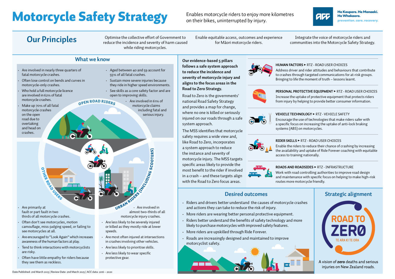 The MSS identifies that motorcycle safety requires a wide view and, like Road to Zero, incorporates a system approach to reduce the instance and severity of motorcycle injury. The MSS targets specific areas likely to provide the most benefit to the rider if involved in a crash - and these targets align with the Road to Zero focus area,